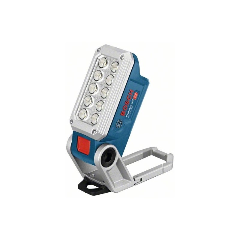 Lámpara a batería GLI 12V-330; La versátil linterna de 330 lúmenes en la categoría de 12 V; Extremadamente luminosa: 10 LED con dos niveles de intensidad para conseguir una perfecta iluminación; Colocación versátil y rápida en el puesto de trabajo gracias al potente imán, los mosquetones y el gancho; Ángulo ajustable hasta 200°; Compatible con trípodes Bosch (3/4"); Robusta y eficiente gracias al uso de LED; Compatible con todas las baterías de litio de 12 V de Bosch; Caja de cartón
