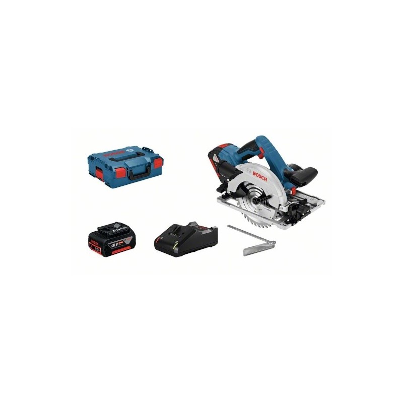 Sierra circular a batería GKS 18V-57 G; Utensilio potente para hacer cortes rápidos y precisos; Rendimiento: rápido avance de corte y gran autonomía de funcionamiento gracias al potente motor y a las baterías de 5,0 Ah; Flexibilidad y precisión: el uso del carril guía permite conseguir resultados de trabajo rápidos y precisos; A elección: la sierra circular portátil cuenta ahora también con hoja de sierra en el lado derecho; Diseño robusto: concebido para todo tipo de aplicaciones en obras, incluso en tejados o andamios; Placa base también compatible con otros sistemas convencionales de carriles guía; Maletín L-BOXX 238 (1 600 A00 1RS); 1 sierra circular, Standard for Wood, 165 x 1,7/1,2 x 20 mm, 36 (2 608 642 602); 2 baterías GBA 18V 4.0Ah (1 600 A00 1CH); Cargador rápido GAL 18V-40 Professional (1 600 A01 9RJ)