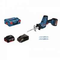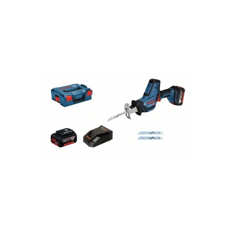 Sierra sable de batería GSA 18 V-LI C; Herramienta compacta y potente: baja vibración; Diseño compacto para múltiples aplicaciones, incluso manejándola con una mano, y para trabajos por encima de la cabeza del usuario; Valores de vibración mínimos para trabajar con comodidad; Rápido avance de corte y gran autonomía gracias al potente motor y a las resistentes baterías; Perfectamente equilibrada y ligera de peso para trabajar en lugares de difícil acceso; Velocidad de corte variable para serrar todo tipo de materiales; Luz LED para tener una visión óptima de la pieza de trabajo al serrar; Sistema SDS para un cambio sencillo de la hoja de sierra; Inserto para L-BOXX 136; Maletín L-BOXX 136 (1 600 A00 1RR); Cargador rápido AL 1860 CV (2 607 225 322); 1 hoja de sierra sable S 922 AF, Flexible for Metal (disponible como juego aparte de 2: 2 608 656 036); 1 hoja de sierra sable S 922 EF, Flexible for Metal (disponible como juego aparte de 2: 2 608 656 038); 1 hoja de sierra sable S 922 HF, Flexible for Wood + Metal (disponible como juego aparte de 2: 2 608 656 039); 2 baterías GBA 18V 5.0Ah (1 600 A00 2U5)