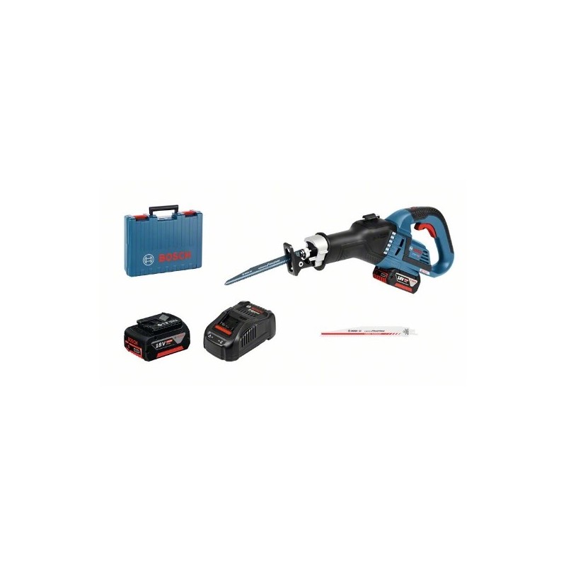 Sierra sable de batería GSA 18V-32; Manejo cómodo en la clase de 18 V; La forma ergonómica única de la empuñadura y el interruptor extralargo permiten una mejor manipulación para trabajos difíciles por encima de la cabeza o en espacios reducidos; El motor EC, cuando se empareja con una batería de tecnología de iones de lito de 18 V de Bosch, ofrece alimentación por cable con libertad inalámbrica; Vibración reducida para garantizar un trabajo sin fatiga; SDS para cambiar la hoja de sierra de manera sencilla y segura al llevar guantes protectores; Preselección de velocidad de corte variable para serrar todo tipo de materiales; Placa base ajustable para hacer uso completo de la hoja de sierra; Maletín de transporte; Cargador rápido GAL 1880 CV (1 600 A00 B8G); 1 hoja de sierra sable S 1130 CF, Endurance for Heavy Metal (disponible como juego aparte de 5: 2 608 657 528); 1 hoja de sierra sable S 1156 XHM, Progressor for Wood + Metal (2 608 653 100); Caja de hojas de sierra; 2 baterías GBA 18V 5.0Ah (1 600 A00 2U5)