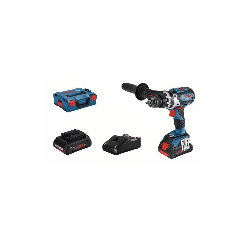 Atornilladores taladradores de percusión a batería GSB 18V-110 C; Conéctese con su taladro con percusión a batería; Potente: par de giro máximo de 110 Nm y motor sin escobillas para un trabajo rápido; Robusto: portabrocas totalmente metálico para las aplicaciones más exigentes en la obra; KickBack Control y empuñadura adicional que reduce el riesgo de una reacción de rotación repentina en caso de atasco; El control de retroceso Kickback Control aumenta la protección del usuario en comparación con otras herramientas eléctricas que no presentan esta función. La herramienta eléctrica se apagará de inmediato si se produce un giro repentino alrededor de los ejes de perforación; Empuñadura adicional codificada y un sencillo mecanismo de bloqueo para un montaje y desmontaje rápidos, y un agarre perfecto; El sistema EMP (Electronic Motor Protection) impide sobrecargas del motor y permite así alargar su vida útil; Las innovadoras baterías COOLPACK garantizan una óptima disipación térmica y prolongan de este modo la vida útil hasta un 100 % (en comparación con las baterías de litio sin COOLPACK); Sistema ECP de Bosch (Electronic Cell Protection): protege la batería contra sobrecarga, calentamiento y descarga total; Luz LED integrada para la iluminación del área de trabajo, incluso en lugares oscuros; Empuñadura adicional (1 602 025 07X); 2 baterías ProCORE18V 4.0Ah (1 600 A01 6GB); Cargador rápido GAL 18V-40 Professional (1 600 A01 9RJ); Maletín L-BOXX 136 (1 600 A00 1RR)