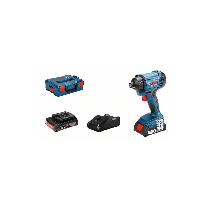 Atornillador de impacto a batería GDR 18 V-160; Perfecta relación de coste-rendimiento entre los taladros atornilladores de percusión profesionales en la categoría de 18 voltios; Eficaz: progreso y trabajo gráfico gracias a una alta velocidad y un par de apriete elevado; Potente: hasta las aplicaciones más difíciles se simplifican gracias al elevado par de apriete; Conveniente: manejo sencillo gracias a su nuevo diseño ergonómico; 2 baterías GBA 18V 2.0Ah (1 600 Z00 036); Cargador AL 1820 CV (2 607 225 424); L-BOXX 136 (1 600 A01 2G0); 1/2 bandeja para L-BOXX, accesorios (1 600 A00 2WC); Bandeja 1/2 L-BOXX para herramienta (1 600 A00 M7R)