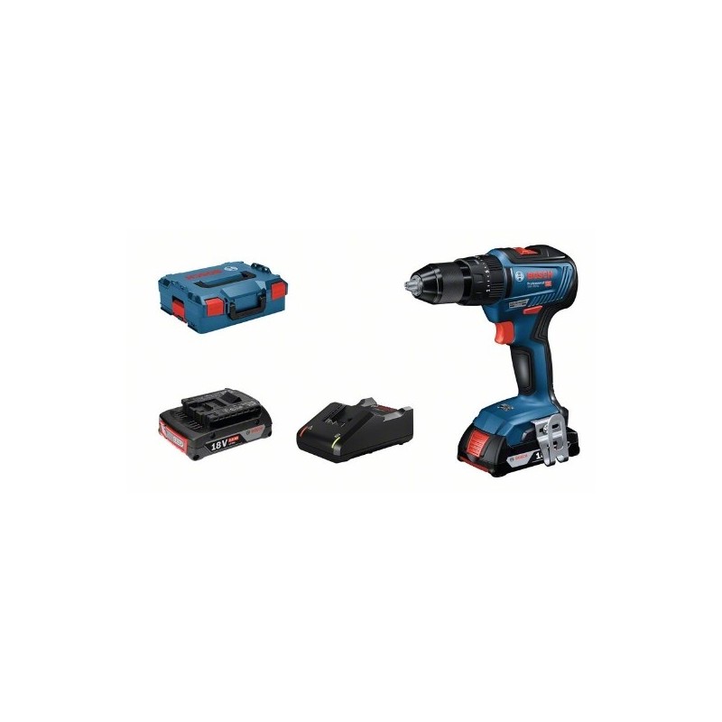 Taladro/atornillador a batería GSB 18V-55; El potente taladro de percusión básico de Bosch de 18 V con motor sin escobillas; Resistente y potente: el rendimiento de 55 Nm y 1750 rpm garantiza una eficiencia máxima para el trabajo en madera, metal y mampostería; El robusto portabrocas metálico de 13 mm Röhm ofrece una transferencia de potencia ideal para trabajos de taladrado y atornillado; El motor sin escobillas garantiza una vida útil prolongada de la herramienta y mayor autonomía de las baterías; 2 baterías GBA 18V 2.0Ah (1 600 Z00 036); Cargador rápido GAL 18V-40 Professional (1 600 A01 9RJ); Maletín L-BOXX 136 (1 600 A00 1RR)