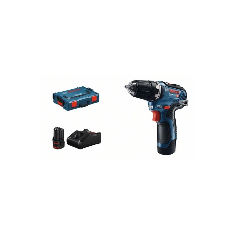 Taladro/atornillador a batería GSR 12V-35; El taladro/atornillador con el mejor rendimiento y el diseño más compacto de la categoría de 12 V; Su diseño compacto favorece un manejo óptimo, especialmente al trabajar en altura o en espacios estrechos; La mejor relación tamaño-rendimiento: par de giro duro de 35 Nm, 0-1750 rpm, longitud del cabezal: 154 mm; El motor sin escobillas, combinado con el sistema Electronic Motor Protection, evita las sobrecargas y prolonga la vida útil de la herramienta; Cargador rápido GAL 12V-40 Professional (1 600 A01 9R3); 2 baterías GBA 12V 3.0Ah (1 600 A00 X79); Maletín L-BOXX 102 (1 600 A00 1RP)
